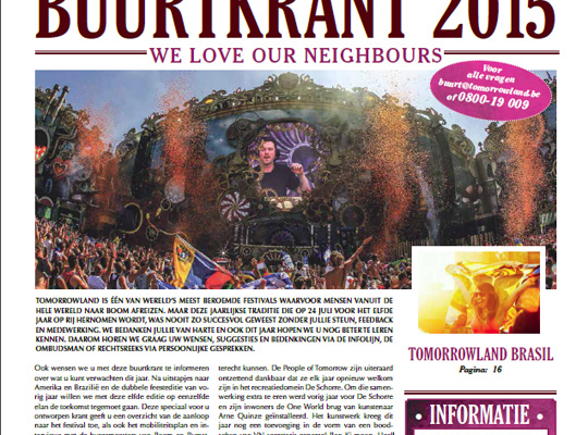 De organisatie van Tomorrowland heeft de afgelopen dagen traditiegetrouw hun buurtkrant vol praktische tips, info en en mogelijkheden tot communicatie verdeeld: "Tomorrowland is één van wereld’s meest beroemde festivals waarvoor mensen vanuit de hele wereld naar Boom afreizen. Maar deze traditie die op 24 juli voor het elfde jaar op rij hernomen wordt, zou nooit zo succesvol kunnen zijn zonder jullie steun, feedback en medewerking. We bedanken jullie van harte en ook dit jaar hopen we u steeds beter te leren kennen. Daarom horen we graag uw wensen, suggesties en bedenkingen via de infolijn, de ombudsman of rechtsreeks via persoonlijke gesprekken."